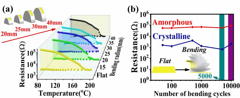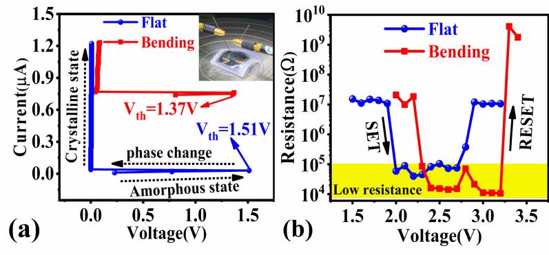 为了探究相变材料在柔性存储方面的潜在价值,该课题组采用磁控溅射的工艺在PEEK衬底上制备了Sb单层薄膜及器件并进行了性能测试。在不同弯曲半径的模型下弯曲24h仍能保持完整的相变特性,多次弯曲后仍能保持良好的弯曲耐久性。拉伸前后的漂移系数变化小,Sb薄膜具有较好的抗拉伸性能。器件单元在弯曲前后仍可以实现SET和RESET的可逆操作。结果表明,基于PEEK衬底的Sb薄膜及器件具有优异的柔性相变性能,为柔性相变存储器的发展提供了可能。