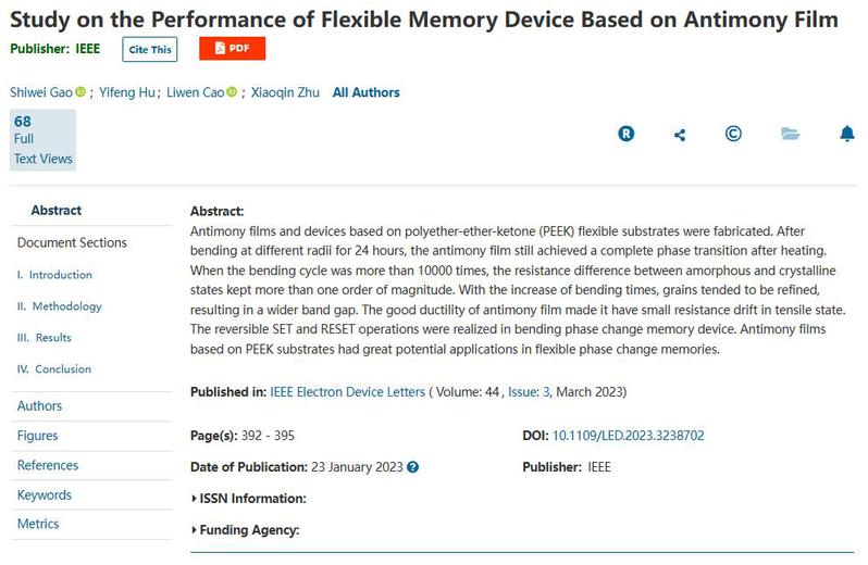 近日,我院胡益丰教授课题组在微电子器件研究领域取得重要进展,研究成果“Study on the Performance of Flexible Memory Device Based on Antimony Film”在微电子领域权威期刊IEEE Electron Device Letters上发表,论文链接https://ieeexplore.ieee.org/document/10024319。
