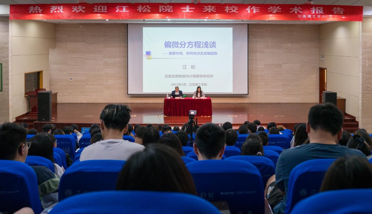 近日,由中国数学会非线性泛函分析专业委员会主办、江苏理工学院承办的“非线性分析国际会议暨第二十三届全国非线性泛函分析会议”期间,中国数学会非线性泛函分析专业委员会主任、北京应用物理与计算数学研究所研究员江松院士应邀来我院,为23、24级学生作《偏微分方程浅谈》主题报告。