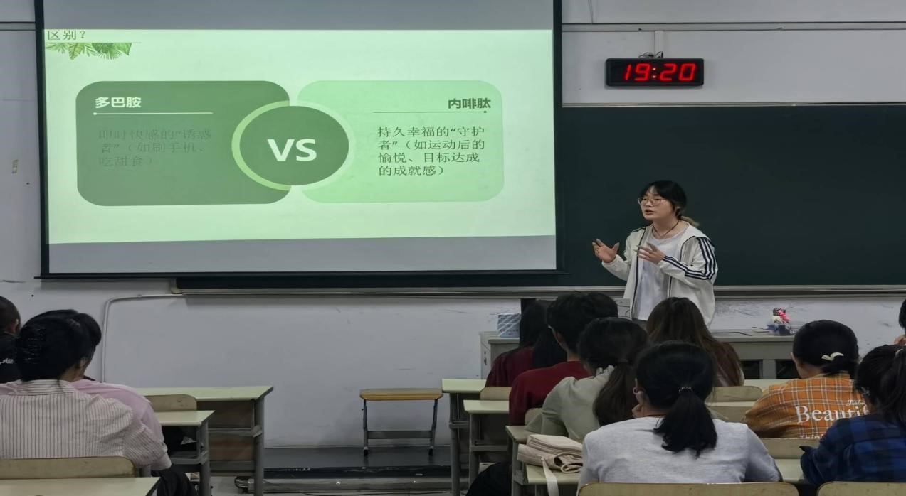 活动伊始,主讲人通过“开学后最愉快的事”进行提问互动以及图片对比,迅速拉近与学生的距离,引出多巴胺与内啡肽的主题。在理论讲解环节,主讲人详细阐述了多巴胺负责传递即时快感、易导致依赖成瘾,内啡肽带来平静与成就感、需努力获取的生理机制与心理影响,从触发条件、持续时间、心理体验、长期影响四个方面对比两者差异,帮助学生建立清晰认知。