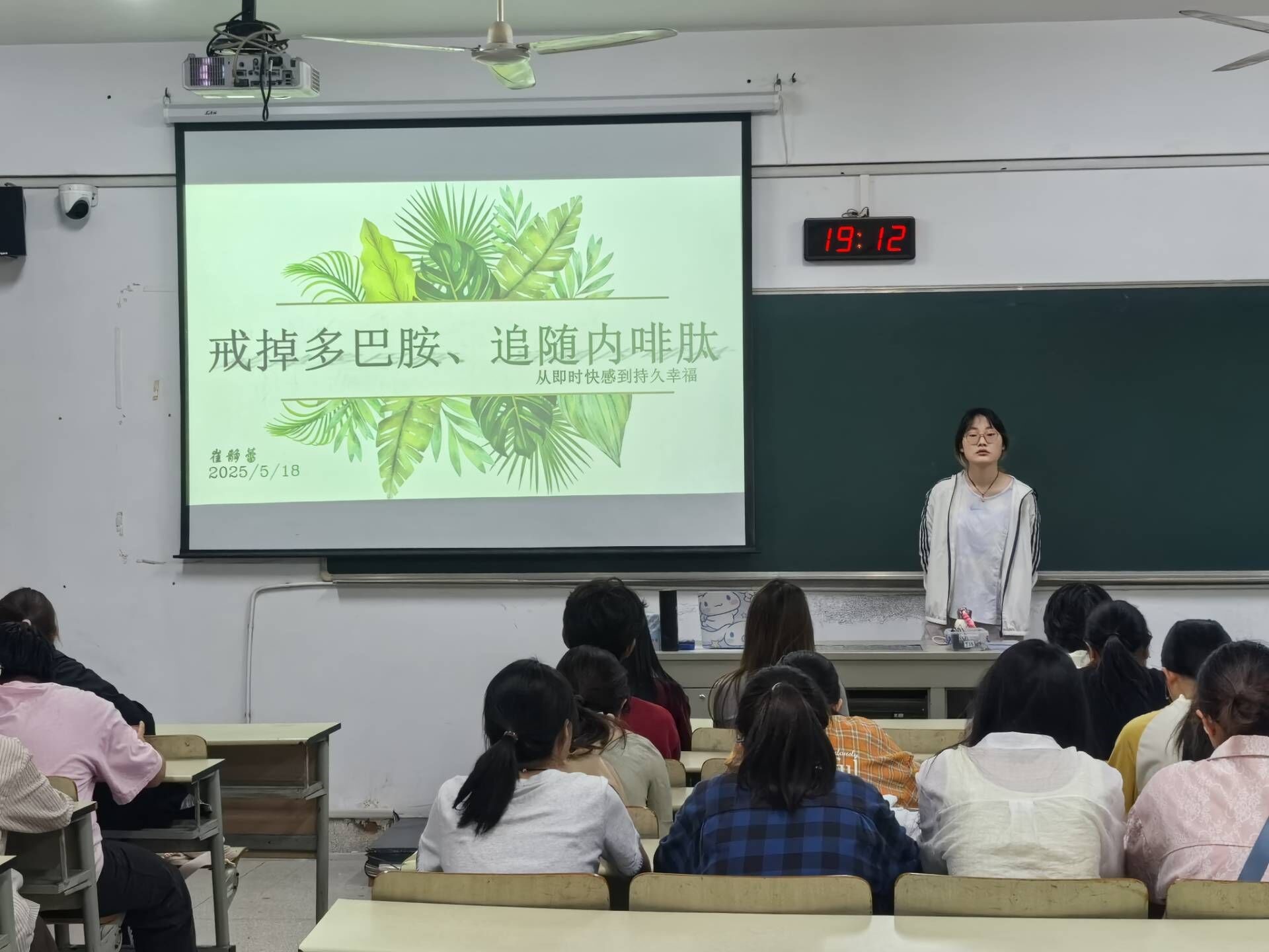 为引导大学生正确认识即时快感与长期满足的关系,培养积极健康的心理状态与行为习惯,数理学院于5月18日19点,在59号楼514教室为同学们进行“戒掉多巴胺,追随内啡肽:从即时快感到长期满足”心理健康知识宣讲活动。本次活动由教育学院23级心理专业的崔静蕾同学担任主讲人。
