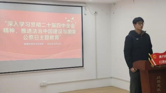 为深入学习贯彻党的二十届四中全会精神,推进法治中国建设,同时缅怀革命先烈、传承红色基因,数理学院学生党支部于2025年12月13日在38号楼一站式学生社区网络思政中心开展系列主题教育宣讲活动,本次宣讲由徐子牧同志主讲,数理学院学生党员参与。