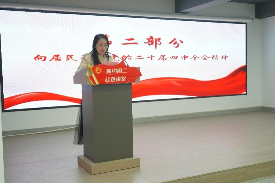 理论学习环节,沈家弄村委党支部杨晓娜书记以专题党课形式,深入解读党的二十届四中全会精神。党课深入浅出、内涵丰富,既阐释了全会精神的核心要义,又结合大学生党员实际提出殷切期望,引导青年党员将理论学习内化于心、外化于行,转化为学习科研、服务社会的实际行动。
