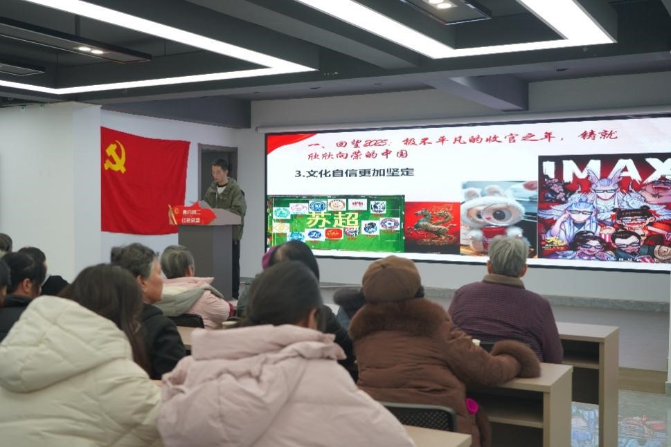 在新年贺词解读环节,全体人员共同观看2025年告别短片,重温年度难忘瞬间,感受祖国繁荣发展的强劲脉动。随后,主持人何信昊围绕2026年新年贺词展开解读,回顾2025年我国的亮眼成绩,缅怀中国人民抗日战争暨世界反法西斯战争胜利80周年等重大纪念时刻。