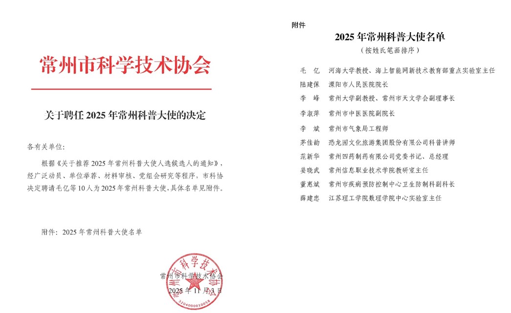 11月3日,常州市科协发布了“关于聘任2025年常州科普大使的决定“,我院教师薛建忠老师凭借在科普服务、创新实践等领域的突出贡献,成功获聘 “常州市科普大使” 称号。